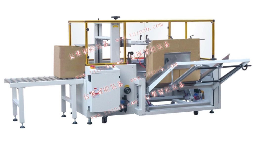 自動完成開箱、成形、下底折葉折曲.并實時完成下部分膠帶粘貼,將疊成紙板的箱板自動打開,箱子底部按一定程序折合,并用膠帶密封后輸送給裝箱機的專用設(shè)備。